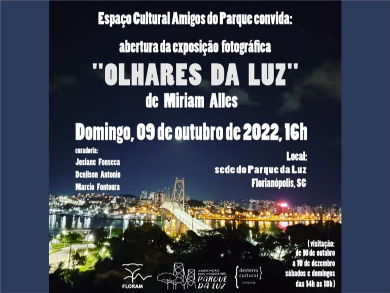 No dia 09.10.2022, aconteceu a abertura da terceira exposição do novo Espaço Cultural Amigos do Parque, na sede do Parque da Luz, "Olhares da Luz". A exposição é uma mostra fotográfica da Amiga do Parque, Miriam Alles. O ECAP é um projeto criado pela Associação dos Amigos do Parque da Luz, Floram e produtoras culturais independentes, a @Desterro Cultural e o @Studio de Ideias. Junto ao Espaço encontra-se o Memorial da AAPLuz. O projeto da Exposição faz parte do setor cultural da AAPLuz, o @Curta o Parque. Agende sua visita pelo email: amigosparquedaluz@gmail.com.