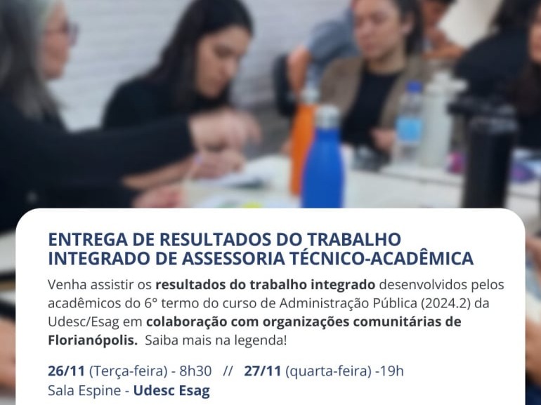 No dia 26.11.24 ocorreu nas dependências da ESAG, a entrega dos resultados dos trabalhos Integrados desenvolvidos pela 6. termo do Curso de Administração Pública (2024.02) da UDESC/ESAG em colaboração com organizações comunitárias de Florianópolis.