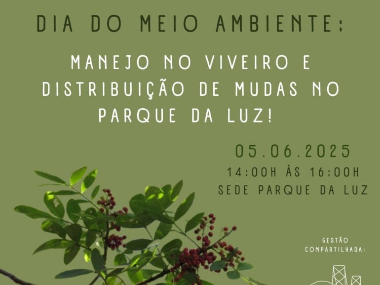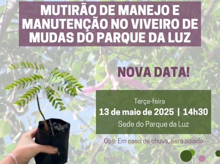 Convidamos toda a comunidade do entorno do Parque da Luz para participar do nosso mutirão de manejo e manutenção do Viveiro de Mudas, que acontecerá na próxima terça-feira (13/05/25) das 14:30 às 17:00 horas na sede do parque.